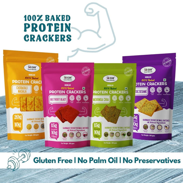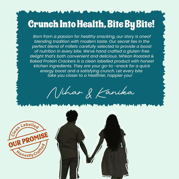 Nihkan Protein Crackers are expertly crafted using sprouted lentils and millets. They are baked, not fried, to deliver a satisfying, hearty crunch. Perfect for anyone seeking a high protein snack or a clean, gluten free substitute for traditional chips and crackers.