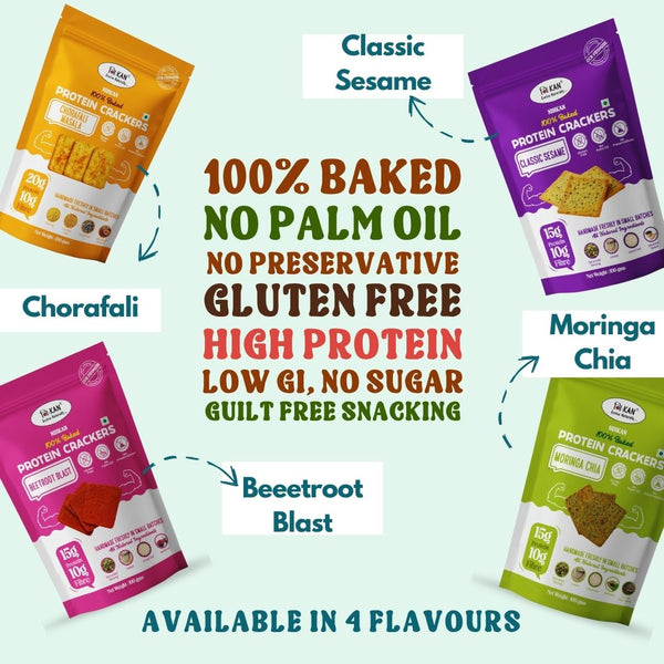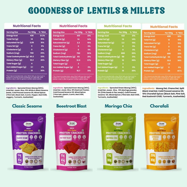 • 💪 Combo of 4 Exciting flavours - Moringa Chia, Beetroot Blast, Classic Sesame & Chorafali Masala. Each pack delivers more than15g of Protein and 10g of Fibre from Sprouted Moong, Jowar, and Urad Dal. Supports satiety, muscle health, and aids digestion—perfect for a High Protein Snack.