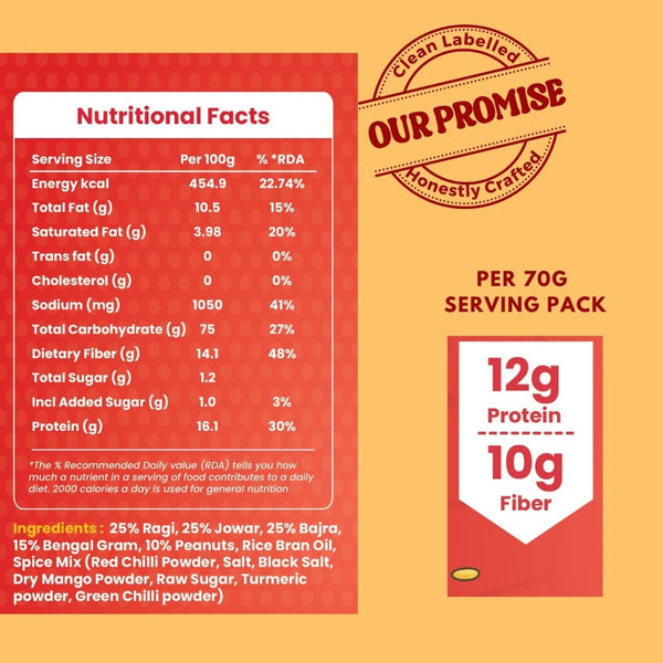 90% Mix ( Ragi, Jowar, Bajra), 10% (Bengal Gram, Peanuts), Rice Bran Oil, Spices (Red Chilli Powder, Salt, Black Salt, Dry Mango Powder, Raw Sugar, Turmeric powder)