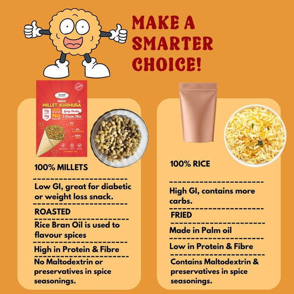 Great meal option for weight watchers, diabetic patients, and fitness enthusiasts seeking a nutritious snacking option. Kurmura mix is made with only millets, peanuts & gram dal and No Maida, No wheat, No Rice, ideal for Sugar control diets as well.