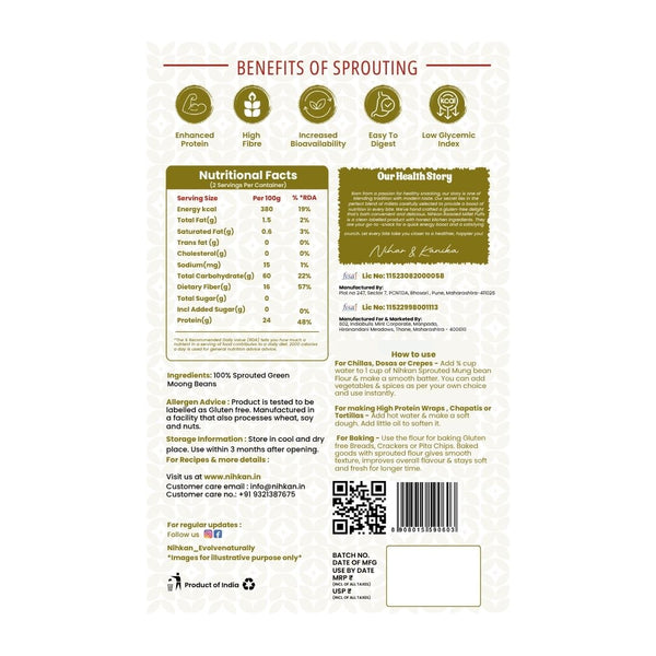 NIHKAN’S Sprouted Mung Flour is a nourishing blend of 100% sprouted Green moong beans grains(pulses). It contains 24g protein per 100g. It is gluten free and sprouted protein flour perfect for making Green mung dal cheelas or dosas for a quick nutritious breakfast meal.