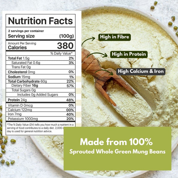 Green moong whole is cleaned, washed thoroughly and left to soak for 12 hours. It is then sprouted over the next 12-24 hours , further dehydrated in low temperatures and milled into flour. This product contains no additives, is free from artificial preservatives, synthetic fillers or binders. It is 100% natural.